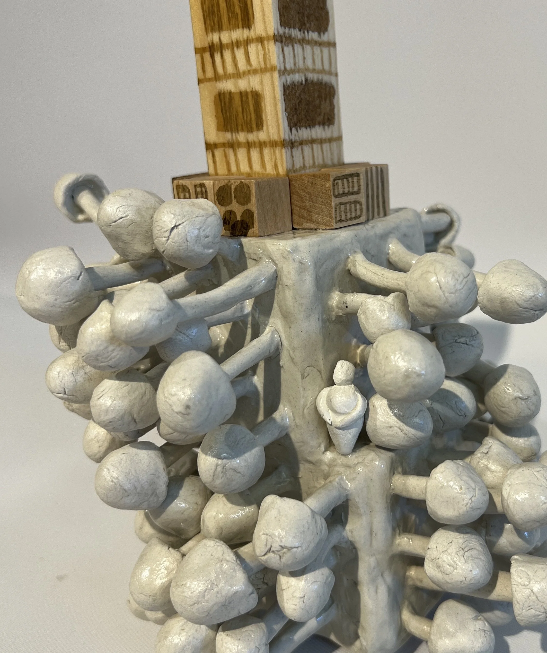 Each of these mini sculptures are metaphors for conditions which I personally struggle with. The mushrooms each tell their own story. The Enoki mushrooms here are good, but there’s just too many! The figure is lost and can’t find the brain.