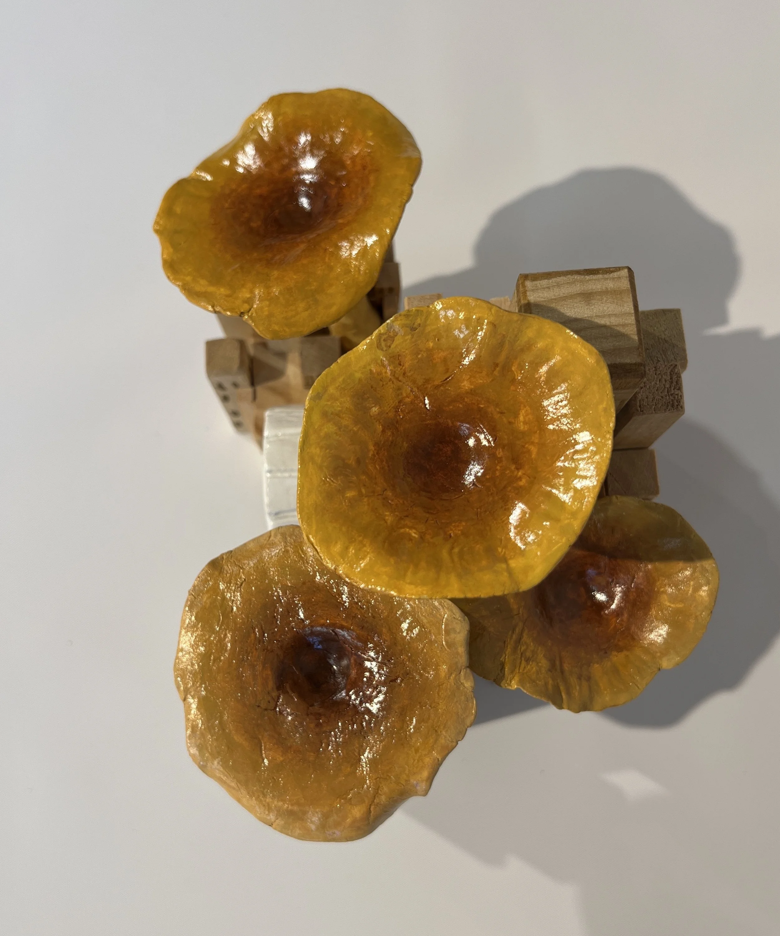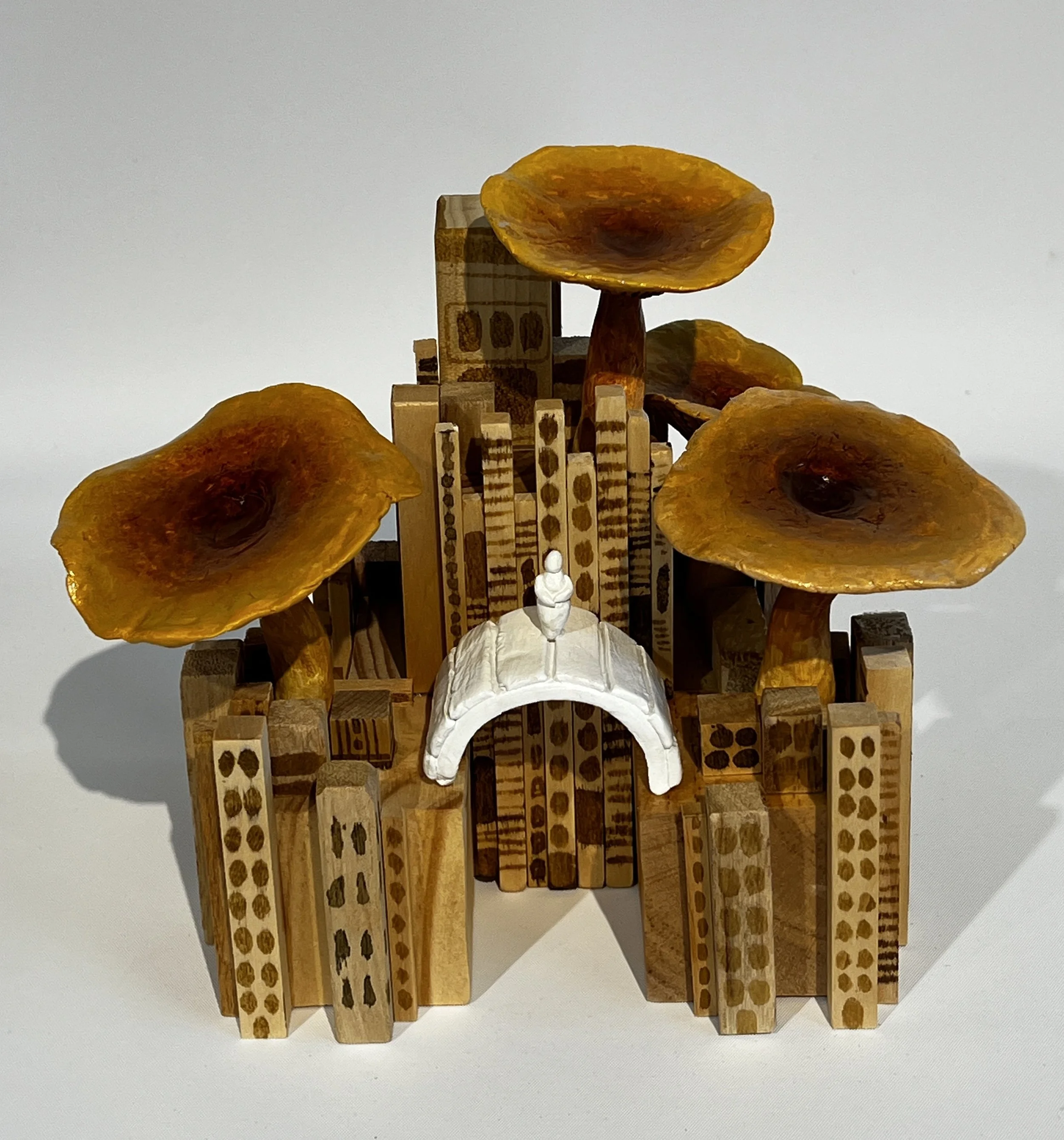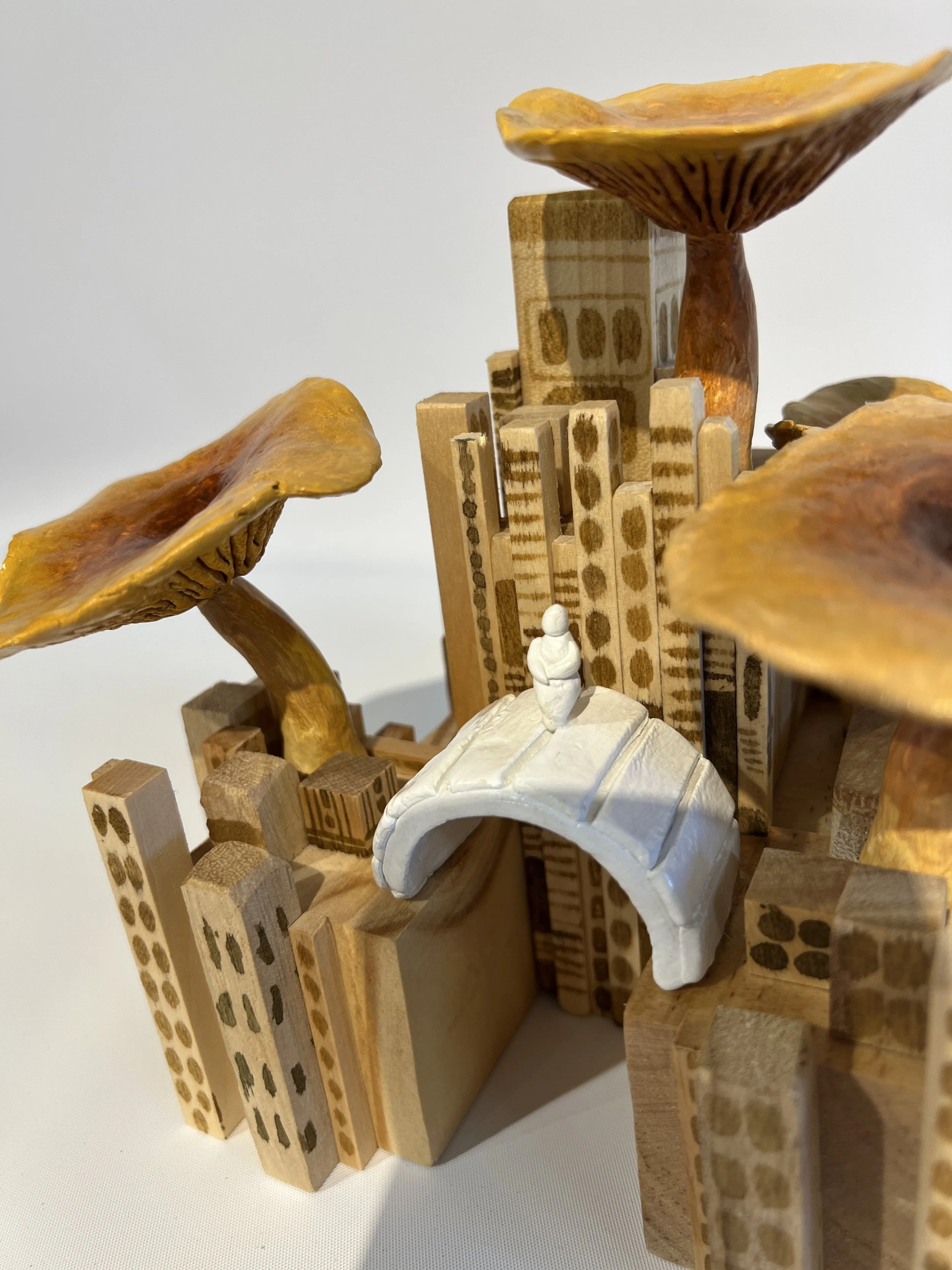 Each of these mini sculptures are metaphors for conditions which I personally struggle with. The mushrooms each tell their own story. These mushrooms are chanterelles, one of the most delicious and sought-after mushrooms. But they are turned away from each other. The figure stands on a bridge over a gap.