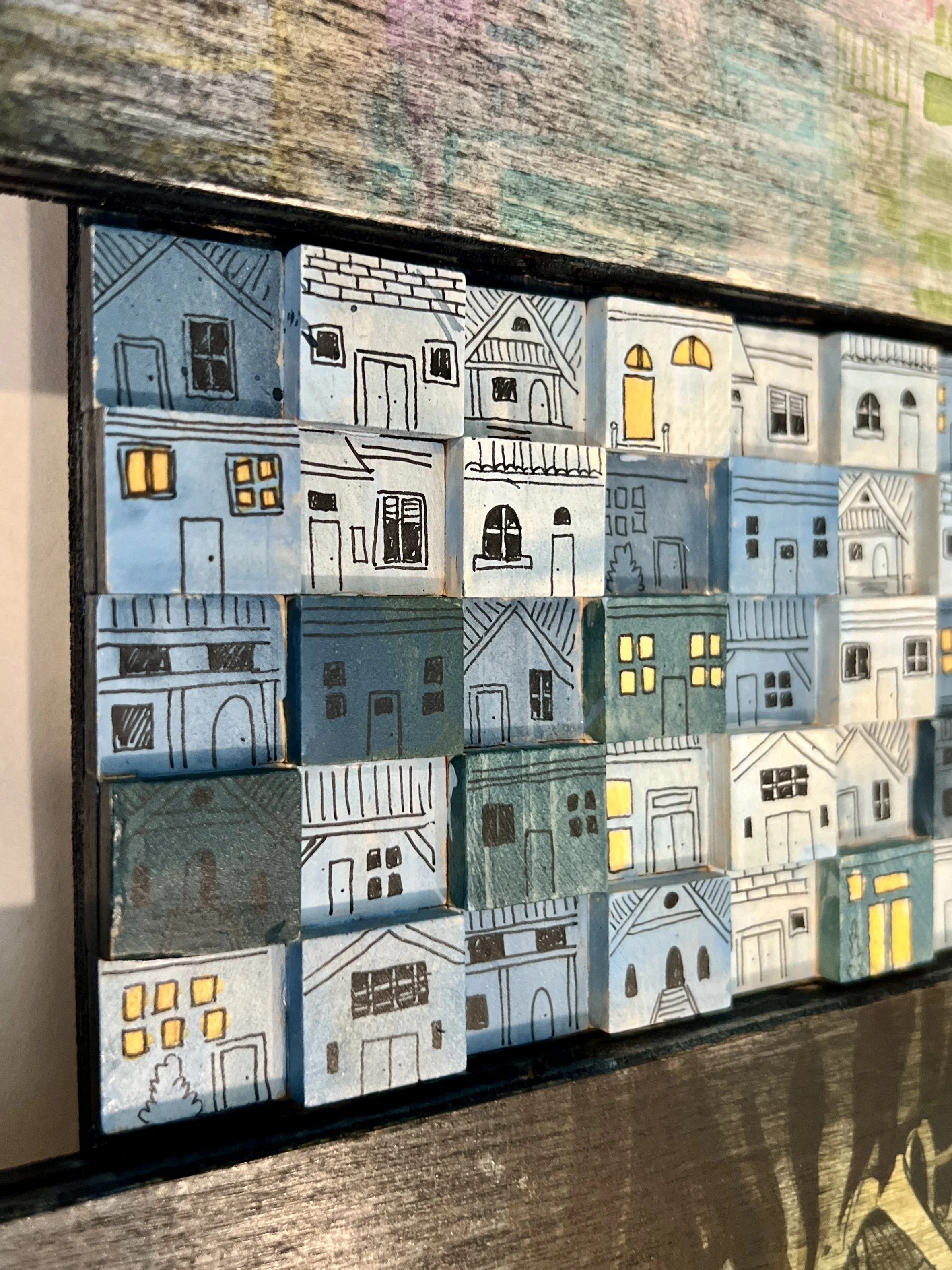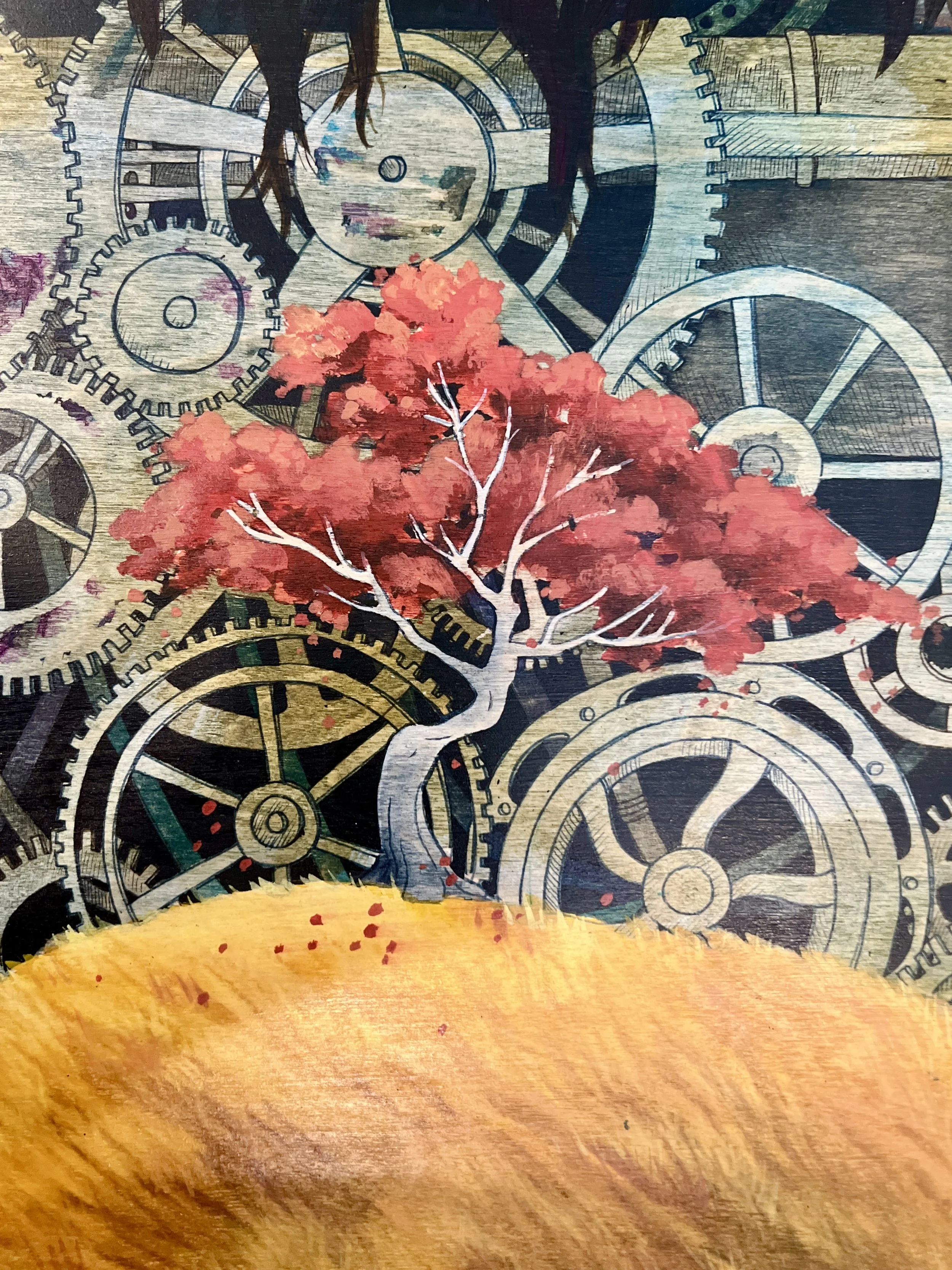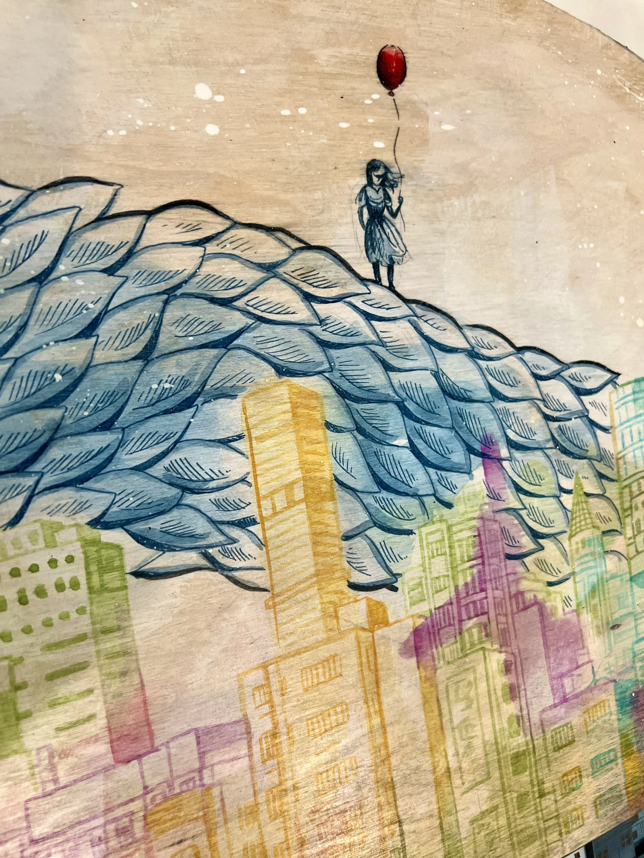 This is a quote from the author Pico Lyn, and one I can relate to extremely well. I always feel like my actual self is hidden under whatever layers I am forced to wear to the outside world. We all do this to a certain extent, but living with autism this truly feels like a survival skill. The top section is the masked self, the cute little girl riding precariously on a serpent’s scaled back. The balloon represents her thought s and feelings being prepared to release to the world. The rainbow city is the pretty mask she is putting on to the world. The rows of houses below is society/ other “normal” people. Below you see the inner mechanisms keeping the facade afloat, a huge interconnected labyrinth of learned behaviors and tactics to appear normal. Inside it all is the true inner self. It is represented by a tree, which in my work means the eternal, and is doubly representing nature as being the only true escape from all this normalcy.
