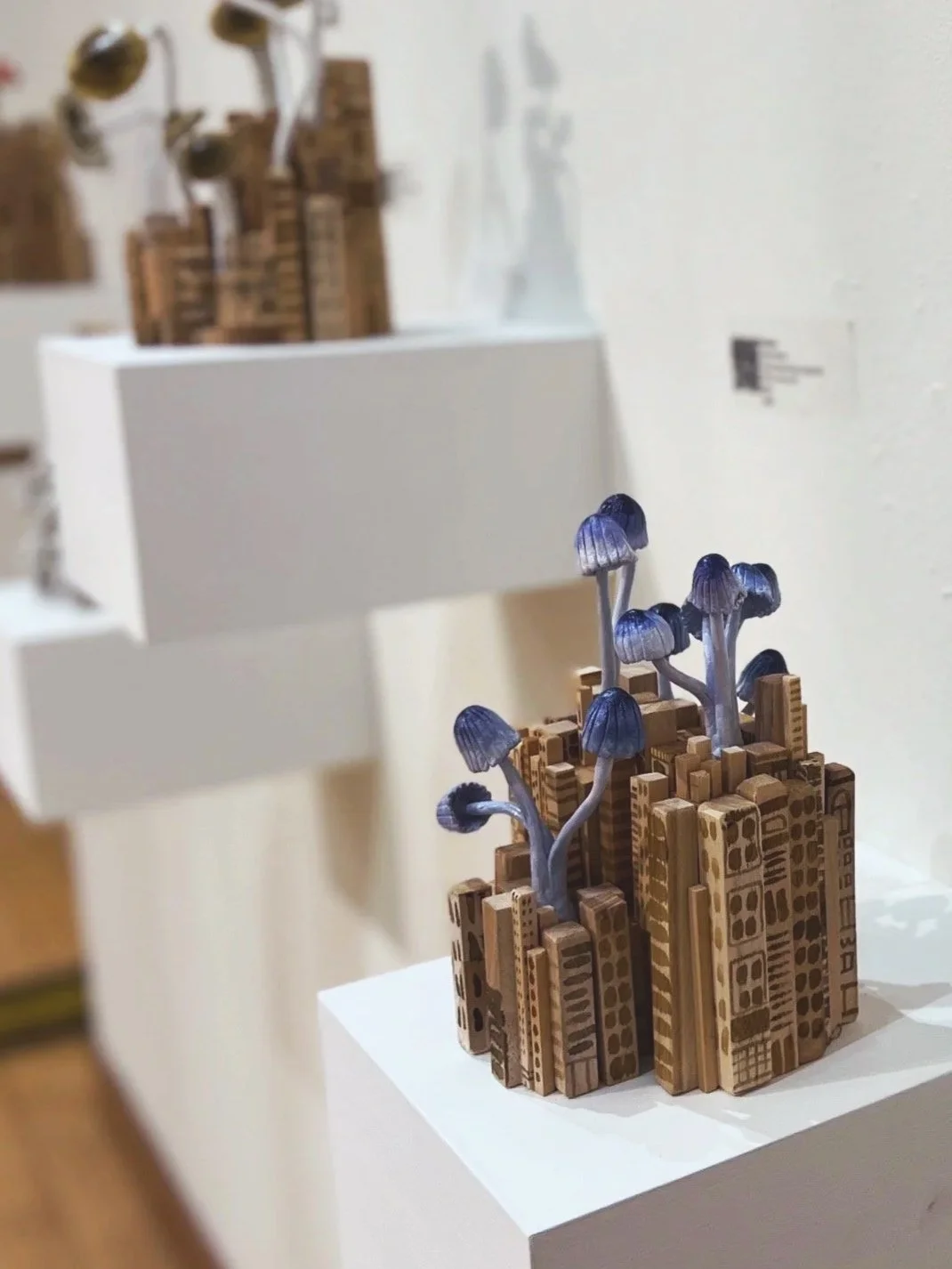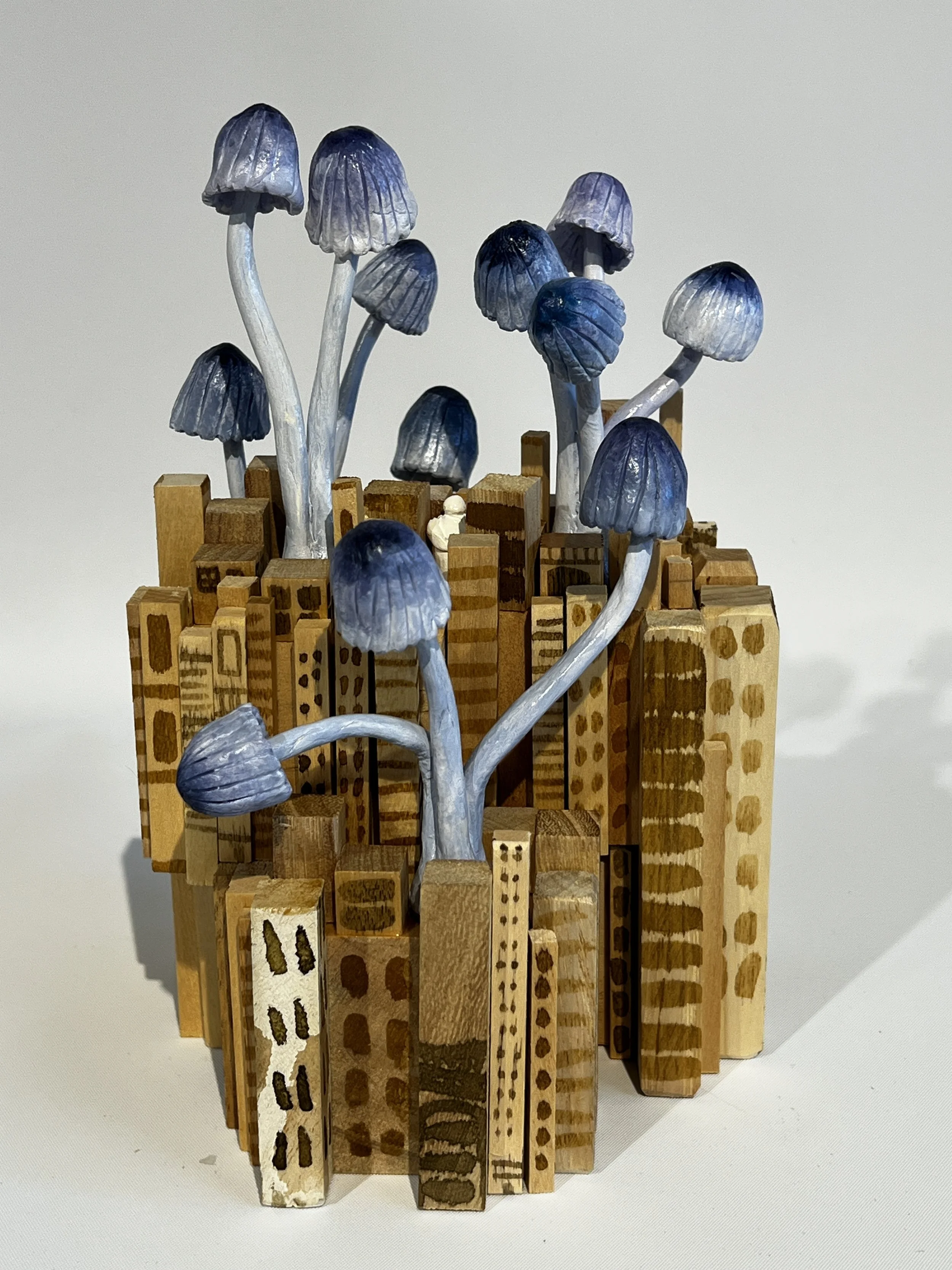 Each of these mini sculptures are metaphors for conditions which I personally struggle with. The mushrooms each tell their own story. The Coprinus Dissemnatus, or fairy bonnet, is a lovely nontoxic mushroom, but it does not preserve well so must be consumed immediately and in short bursts. Being in solitude can be a great thing, but can lead to loneliness or isolation if letting go on too long and is not good for long consumption. The figure is wandering through its isolated path, but looks a little lost.