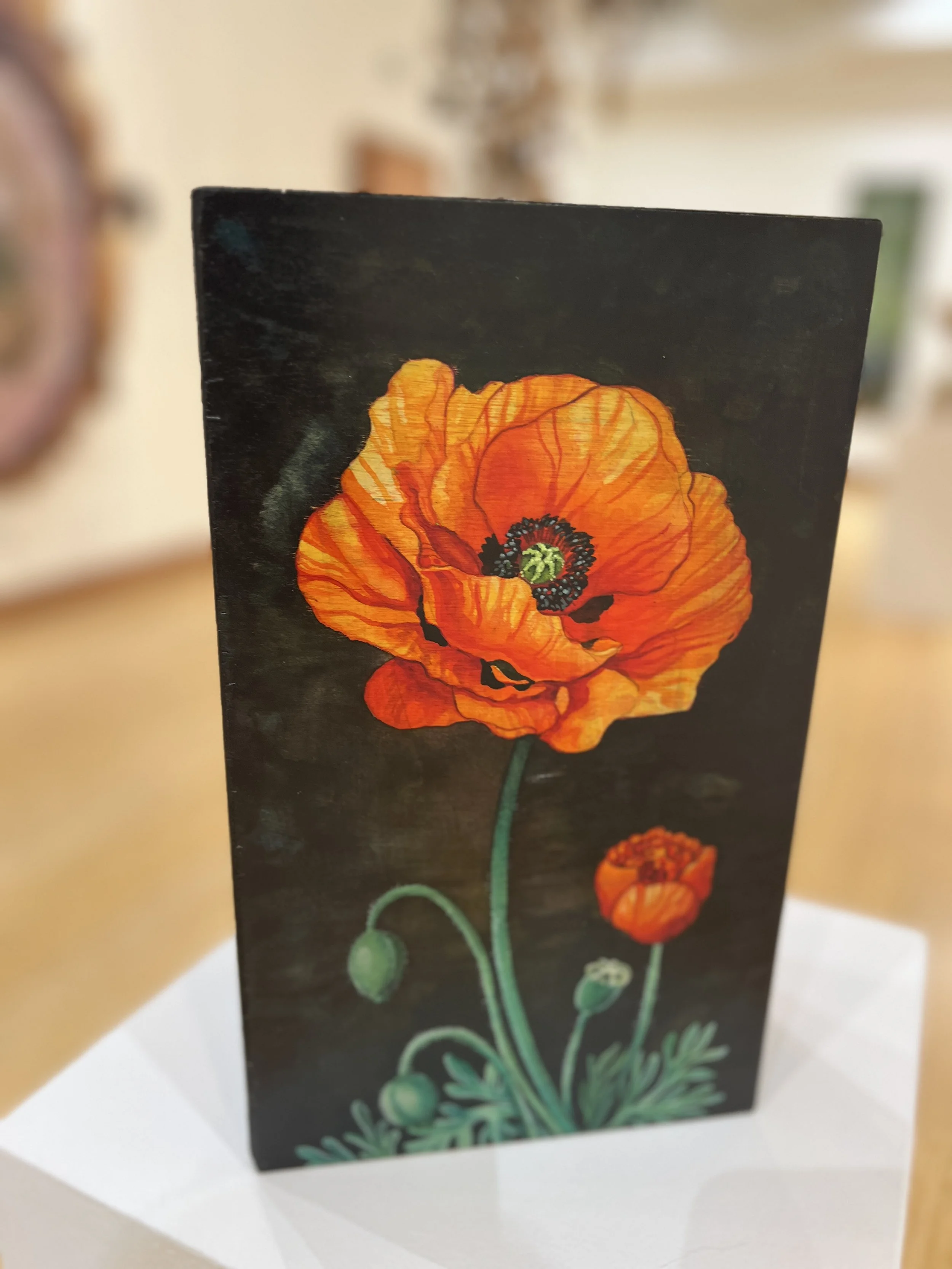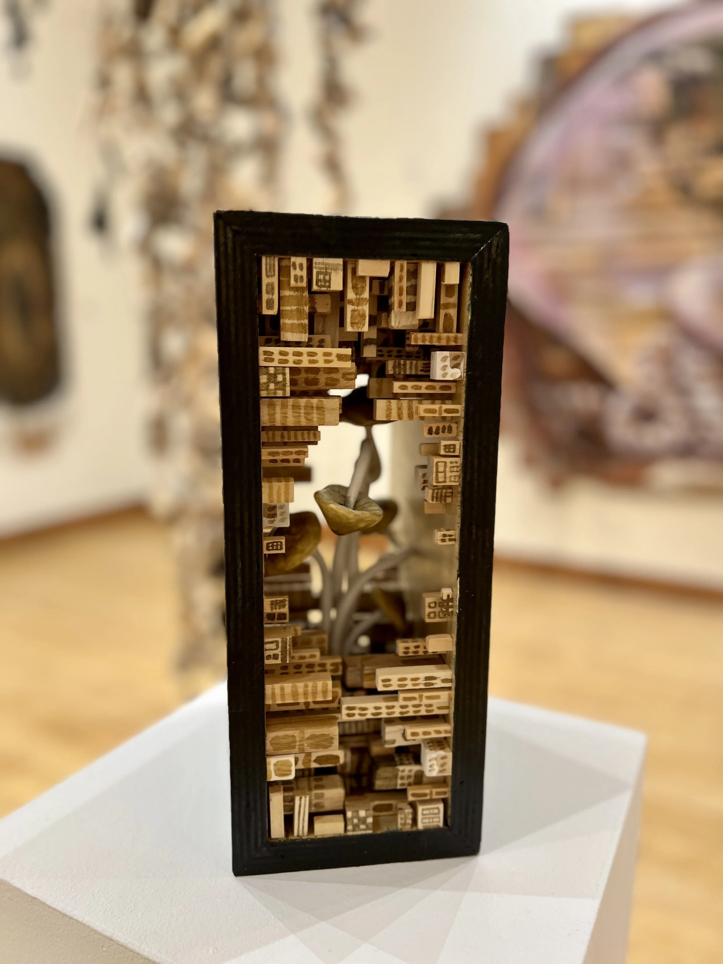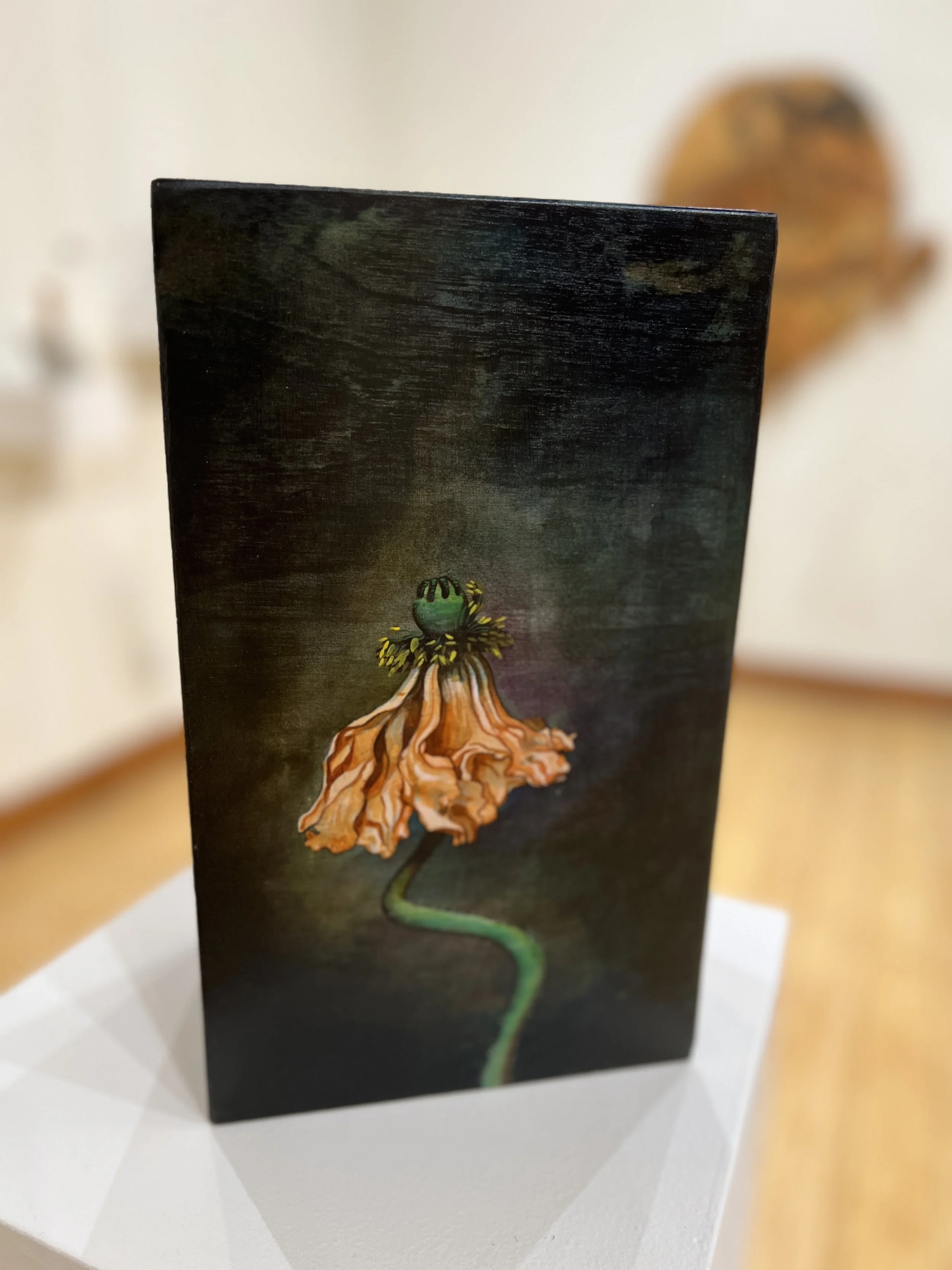 In this piece, I represent the inner workings of the mind via cities, and those inner worries as mushrooms yet again. But this time they are encapsulated in a clean box and living in harmony with one another. On the outside I painted a poppy, alive and beautiful on one side, withering away on the other. The poppy is regularly used to symbolize the shortness of life and rebirth because it is such a short-lived flower. It also is a flower that propagates and spreads faster due to its short life, so it can spread its copious amounts of seeds. From death breeds life.